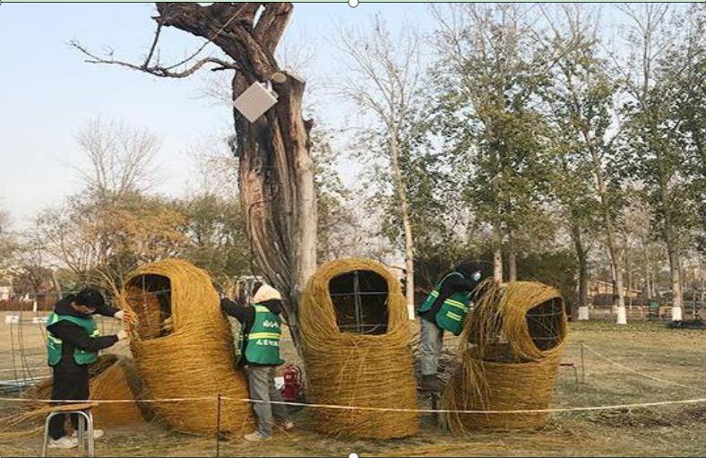 地景藝術(shù)以“生態(tài)環(huán)保、循環(huán)利用、變廢為寶”為理念,以園林廢棄物如柳樹枝、海棠枝、竹枝、桃枝等為主材料,通過設(shè)計師之手把這些變成了一個個栩栩如生的作品,為冬季景觀增色添彩。